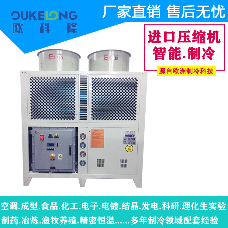 歐科隆15匹防爆冷水機專為化工、制藥、鋰電池等易燃易爆環境研發,通過國家Ex dⅡBT4防爆認證,整機采用防爆壓縮機、防爆電控系統及無火花元件,確保危險場所安全運行,為關鍵生產流程提供可靠制冷保障。